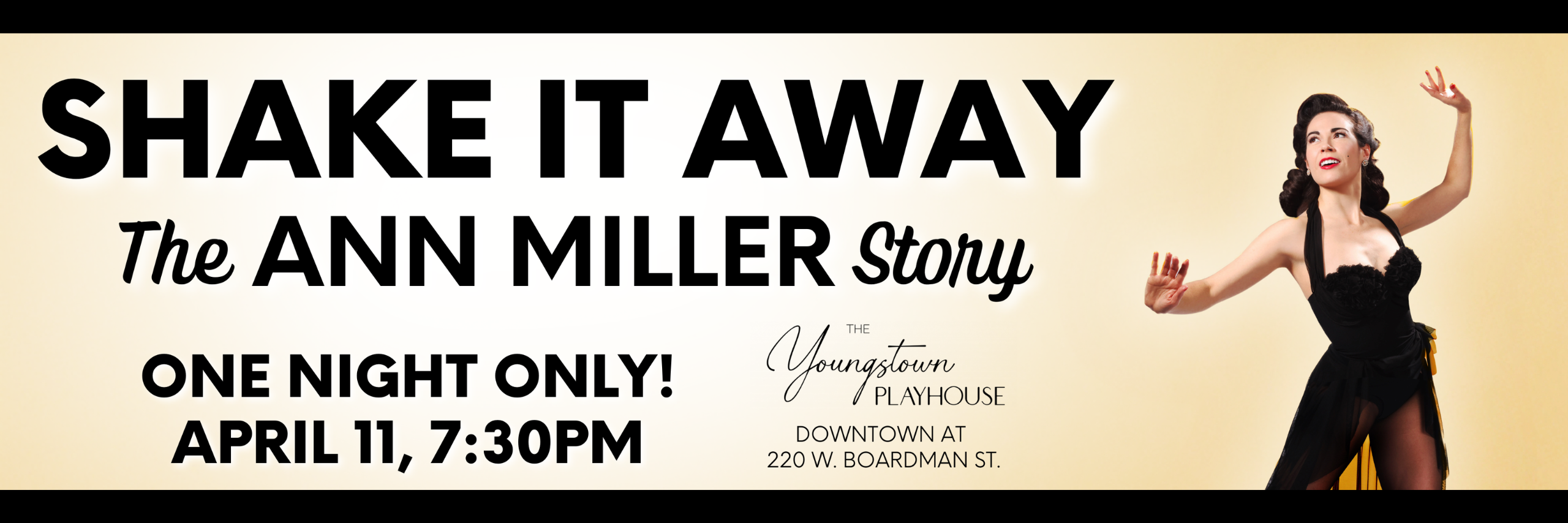 On a soundstage at the infamous 1970 MGM Studios auction, dancer Ann Miller revisits the Golden Age of Hollywood and discovers her second act as a Broadway star. Featuring selections from the Great American Songbook, this love letter to entertainment is written and performed by Kayla Boye, who returns to The Youngstown Playhouse following a critically acclaimed festival tour.